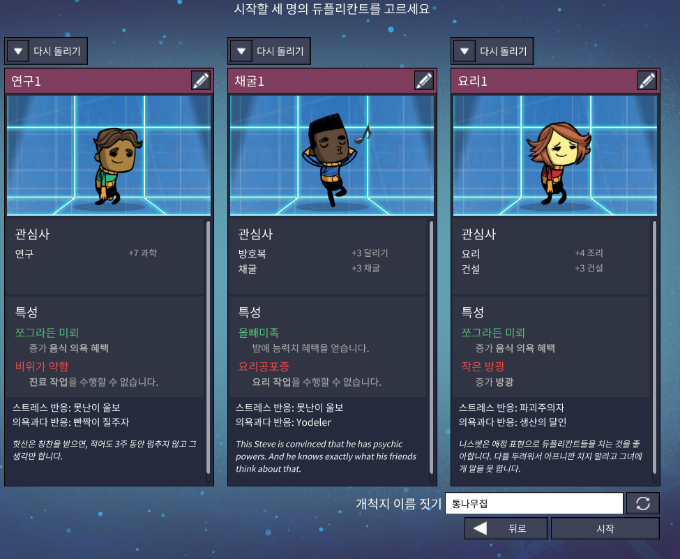 뒤틀린 황천의 요리사는 쪼그라든 미뢰와 같은 효과로 굉장히 좋은 특성입니다. 건설 불가는 절대로 가져가시면 안 됩니다. 구강호흡의 경우 차후에 사용하는 방호복의 사용시간 감소가 있기 때문에 주사위 더 이상 못 굴리겠다 하시는 것 아니면 챙기시면 안 됩니다. 기면증은 시도 때도 없이 자는 바람에 갑자기 의문사하는 경우가 생길 수 있기 때문에 피해 주시고, 알레르기는 차후 농사에 악영항을 주기 때문에 피해 주시는 게 좋습니다. 둔재를 비롯한 능력치 감소는 최대 능력치에서 까기 때문에 어지간하면 안 챙기는 것이 좋습니다. 오히려 요리 불가, 진료 불가 같은 특성은 특화 직업이 있으니 나오면 챙겨주시면 됩니다.(연구 불가의 경우 연구 기술 3개를 못찍으니 선택하시면 안 됩니다.)