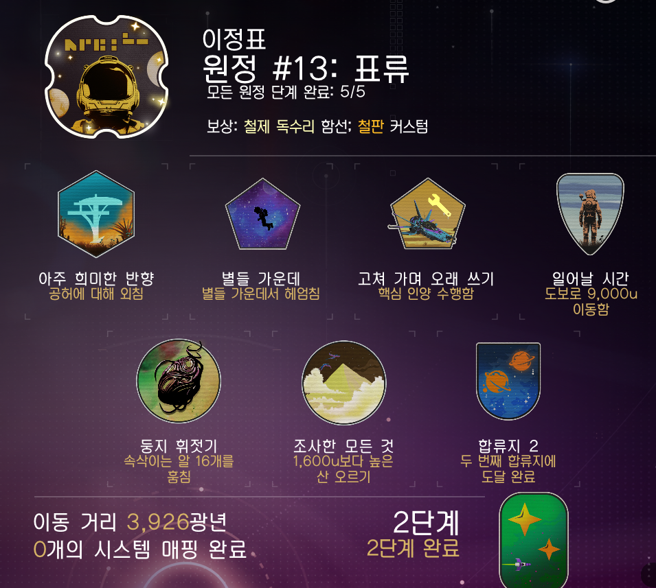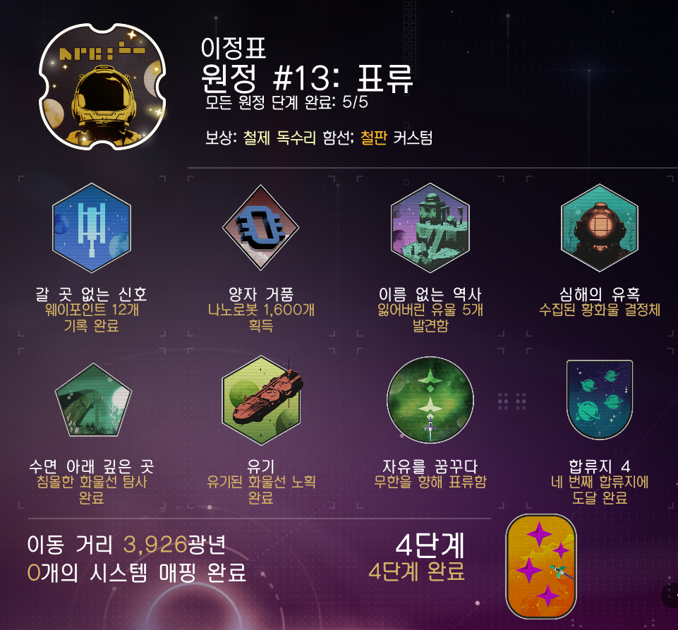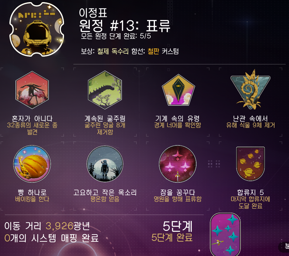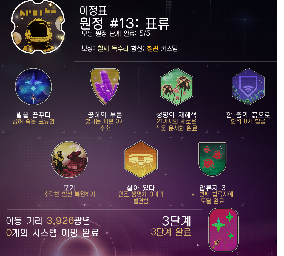 로봇 생명체 3마리를 발견하시면 됩니다. 해당 항목을 활성화하고 은하계 지도로 들어가면 자동으로 생명체가 있는 성계로 안내해 줍니다. 귀신들린이나 검열된 같은 독특한 행성에 있습니다.