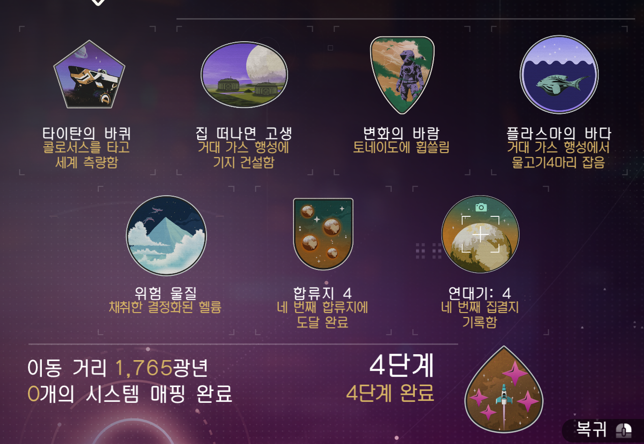 주변 위성 5개를 방문하시면 됩니다.(착륙 후 내려야 합니다.) 가스 행성이 워낙 커서 위성이 안 보이는 경우가 허다하니 주변을 좀 돌아야 합니다.